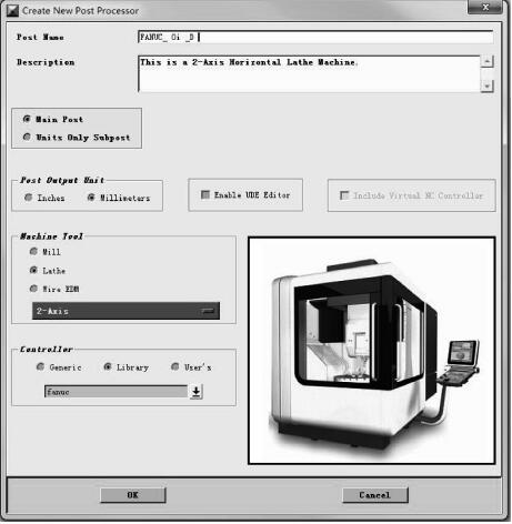 (2)新建一個后處理。在新建后置處理“Creat New Post Processor”對話 框 中 ,Post Name 為 FANUC_ 0i _D,輸出單位“Post Output Unit”設(shè)置為米制,機(jī)床類型選擇 Lathe(車床),機(jī)床控制系統(tǒng)從Library中選擇FANUC,如圖2所示,控制系統(tǒng)的選擇非常重要,一定要正確選擇所用數(shù)控系統(tǒng)。